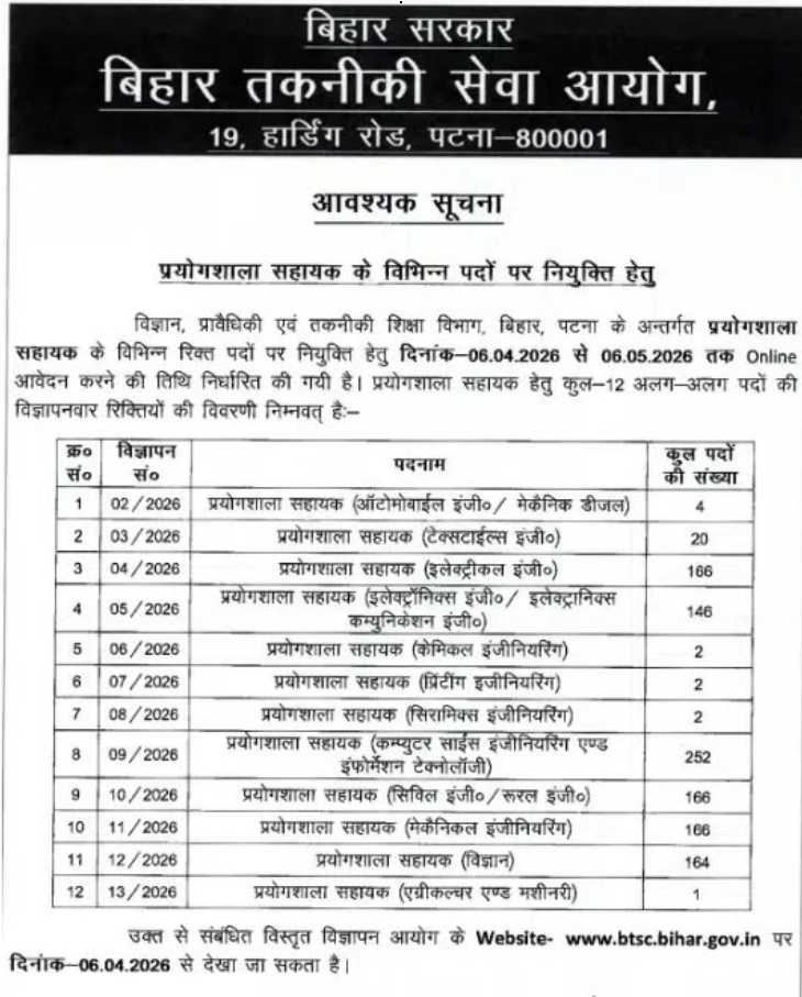 Bihar Technical Service Commission (BTSC) has announced 1,091 vacancies for the post of BTSC Laboratory Assistant Recruitment 2026. Prominent roles include key positions outlined in the Short Details section. BTSC has released the online application form for the year 2026.